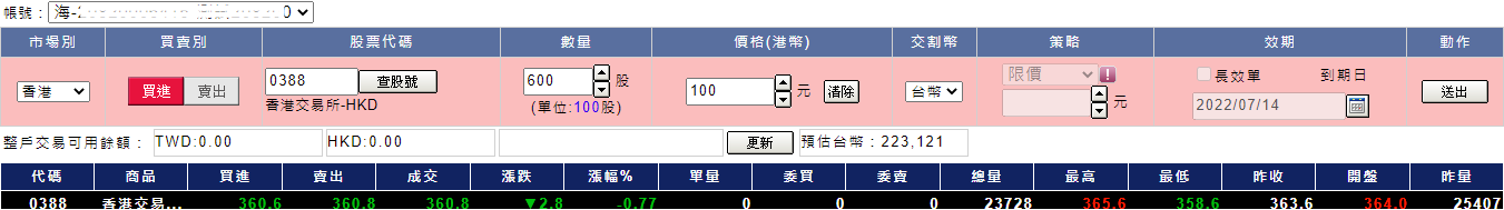)由下拉式選單選擇欲交易的市場別,分「香港」、「美國」、「滬深通」、「日本」。