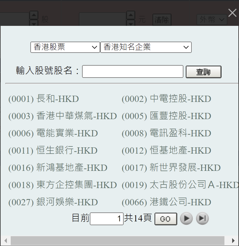 點選〔查股號〕按鈕會依所選市場彈出該市場的「股號查詢」小視窗,可以在小視窗選擇類股,再選取想要交易的股票,系統會把所點選的股票代碼帶到 下單介面的「輸入欄」內; 也可以在「輸入股號股名」欄輸入「股票名稱」或「股票代碼」,按下〔查詢〕按鈕,搜尋出所輸入的「股票名稱」及「股票代碼」。