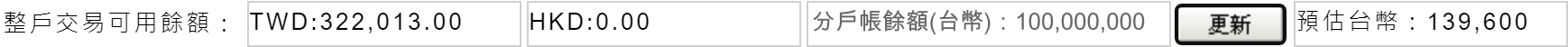 顯示整戶可用交易餘額;有開立分戶帳客戶於「更新」按鈕左邊揭示分戶帳額度資訊;選擇以「台幣」為交割幣別的客戶於「更新」按鈕右方顯示約當台幣預估成本;選擇以「外幣」為交割幣別的客戶於「更新」按鈕右方顯示以原幣計算的預估成本(